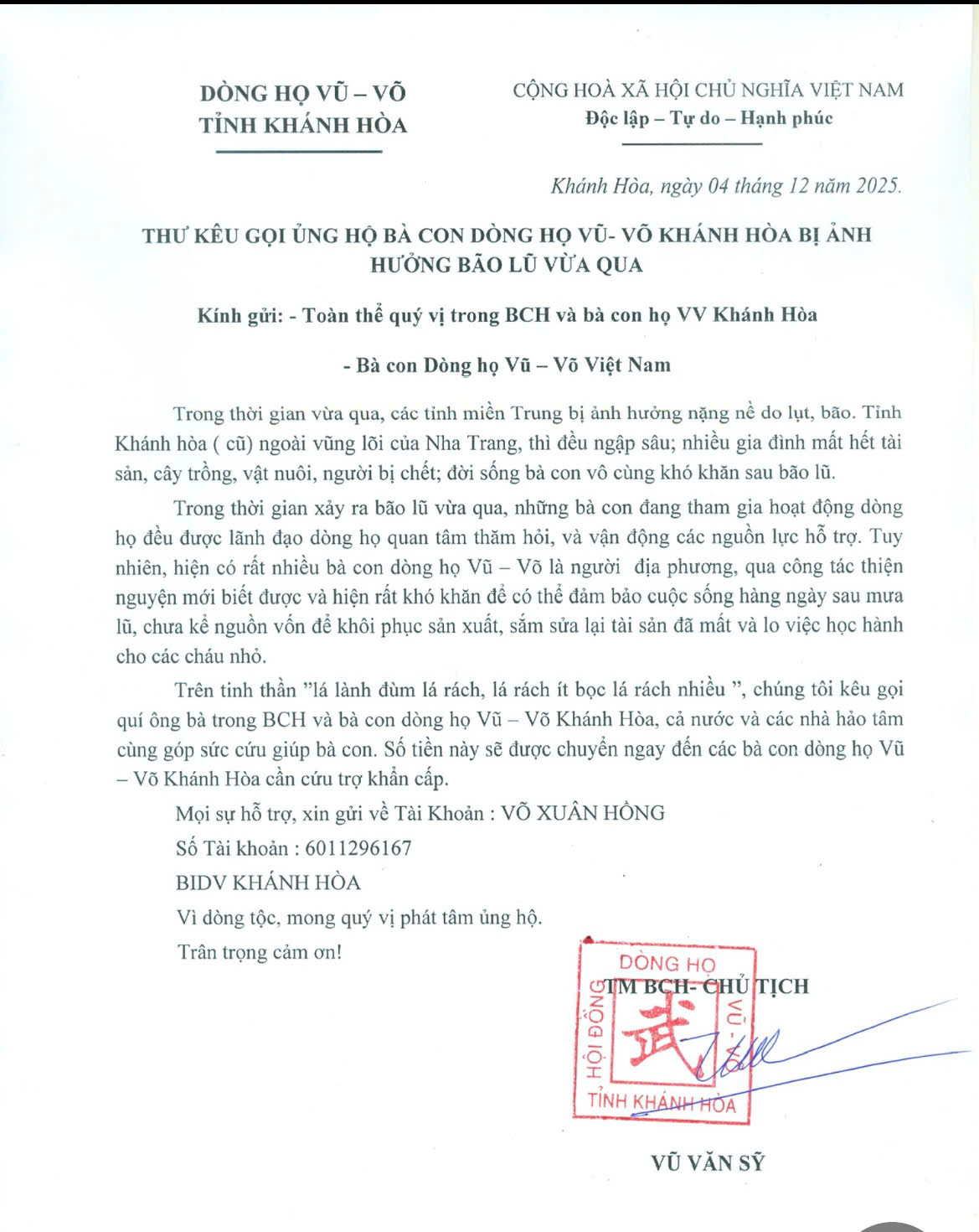 Thiên tai cướp đi nhà cửa, tài sản và cả sinh mạng của không ít gia đình. Nhưng trong hoàn cảnh lấy, tinh thần đoàn kết của dòng họ Vũ – Võ lại càng tỏa sáng. Từ những khoản quyên góp lớn đến từng sự sẻ chia nhỏ bé, tất cả đều mang chung một ý nghĩa: đồng hành cùng bà con vùng lũ bằng tấm lòng chân thành nhất. Những nghĩa cử đẹp đó không chỉ hỗ trợ thiết thực về vật chất, mà còn gửi gắm niềm động viên lớn lao để bà con sớm vượt qua hoạn nạn, ổn định cuộc sống.