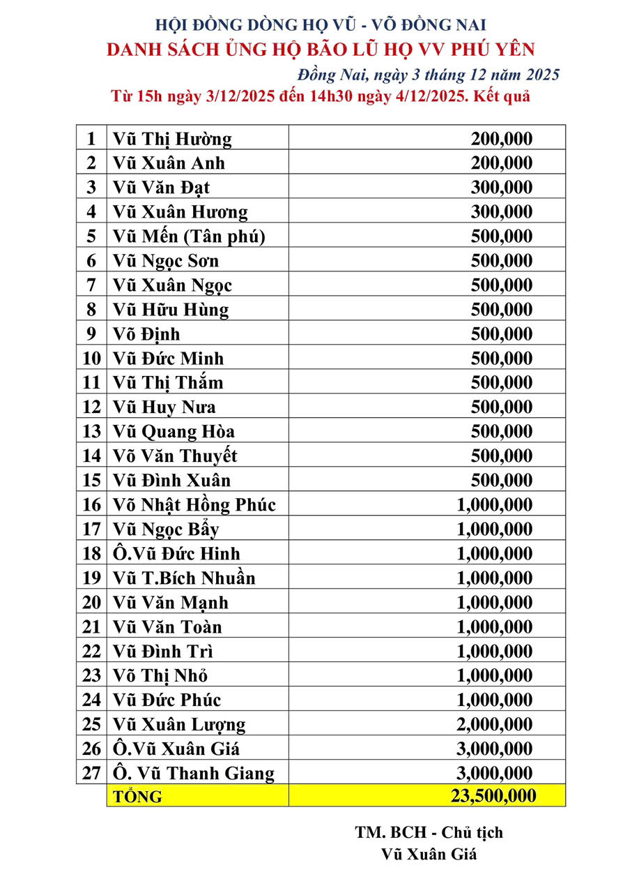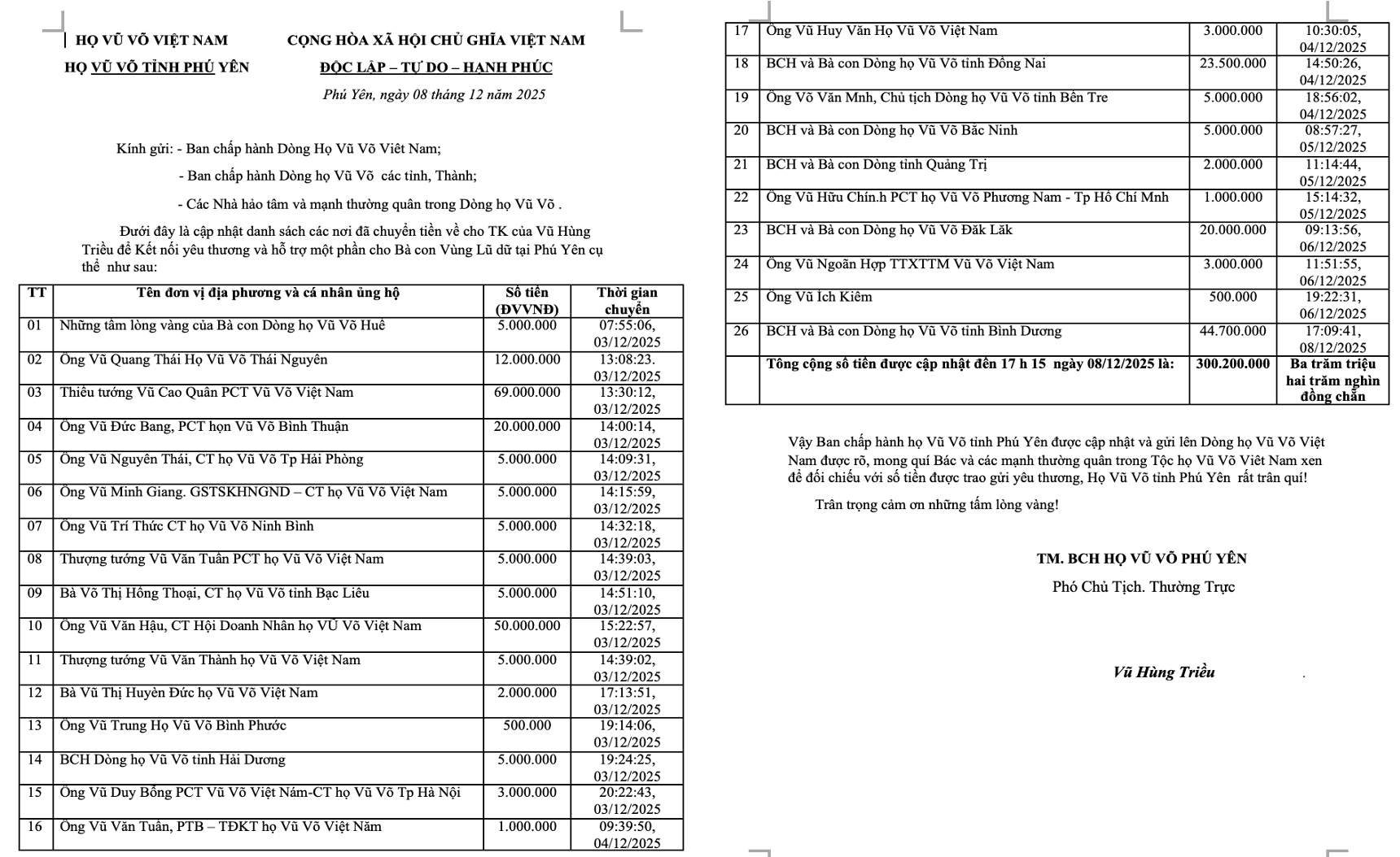 Trước hết là sự chung tay hướng về Phú Yên. Tính đến 20h ngày 4/12/2025, tổng số tiền ủng hộ bà con họ Vũ – Võ tại đây đã đạt 224 triệu đồng. Nhiều đóng góp nổi bật bao gồm: