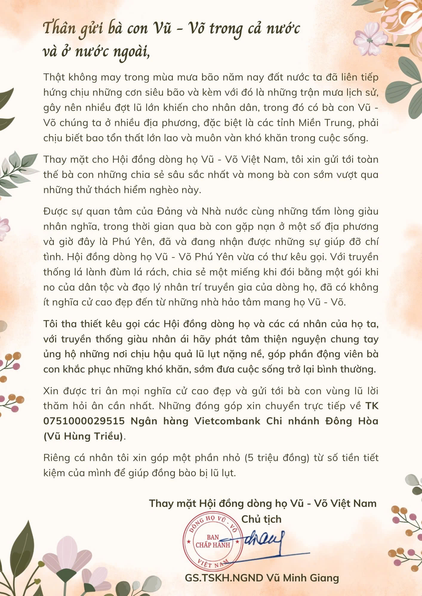 Trong thư, Giáo sư nhấn mạnh, thiệt hại do bão lũ năm nay đem lại quá lớn, nhiều gia đình rơi vào cảnh khó khăn, cùng cực. Chính lúc này, truyền thống “lá lành đùm lá rách”, “một miếng khi đói bằng một gói khi no” của dòng họ càng cần được phát huy hơn bao giờ hết. Từ tấm lòng của mình, Giáo sư cũng đã gửi 5 triệu đồng hỗ trợ bà con vùng lũ ở Phú Yên, đồng thời khích lệ tinh thần đoàn kết của người họ Vũ – Võ trên khắp cả nước. Lời kêu gọi đã nhanh chóng trở thành điểm tựa tinh thần, mở đầu cho một làn sóng hỗ trợ lan tỏa rộng khắp.