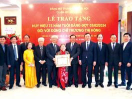 Bí thư Thành ủy hà nội Đinh Tiến Dũng trao Huy hiệu 75 năm tuổi Đảng tặng đồng chí Trương Thị Hồng