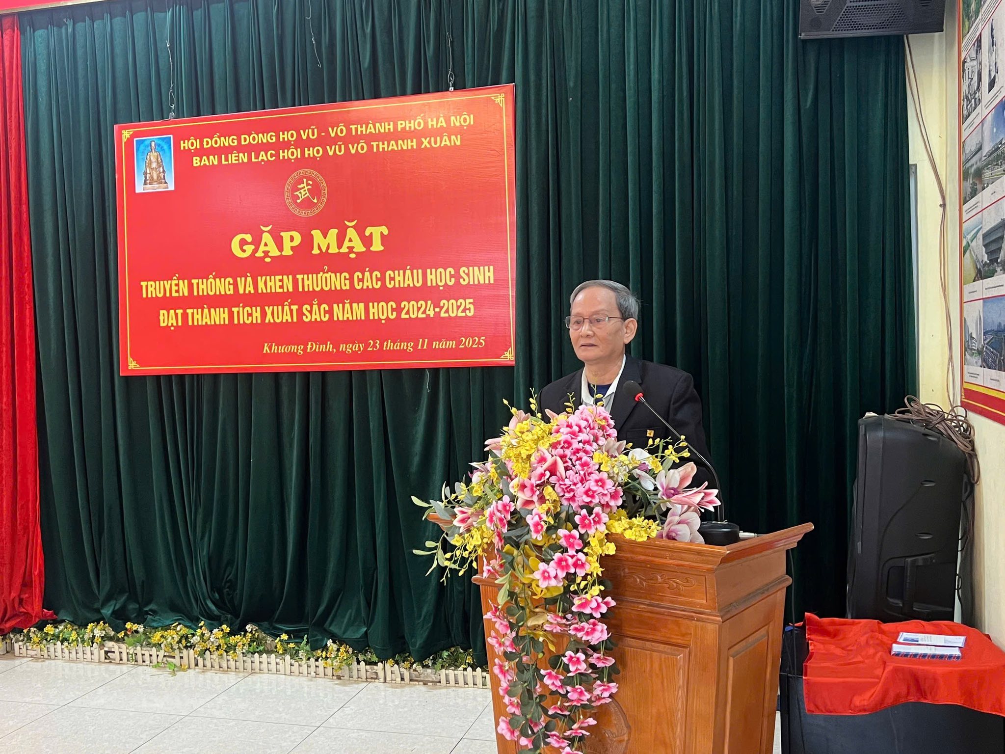 Ông chia sẻ những thành tựu rõ rệt của phong trào Khuyến học Khuyến tài trong toàn hệ thống dòng họ Vũ Võ Hà Nội, đặc biệt đánh giá cao mô hình hoạt động hiệu quả và đầy tâm huyết của Dòng họ Vũ Võ Thanh Xuân.Tại sự kiện cũng ra mắt quỹ Khuyến học Khuyến tài Thanh Xuân, mong muốn đồng hành cùng các gia đình và thế hệ trẻ, tạo ra môi trường học tập lành mạnh, động lực để các cháu nỗ lực vươn lên.