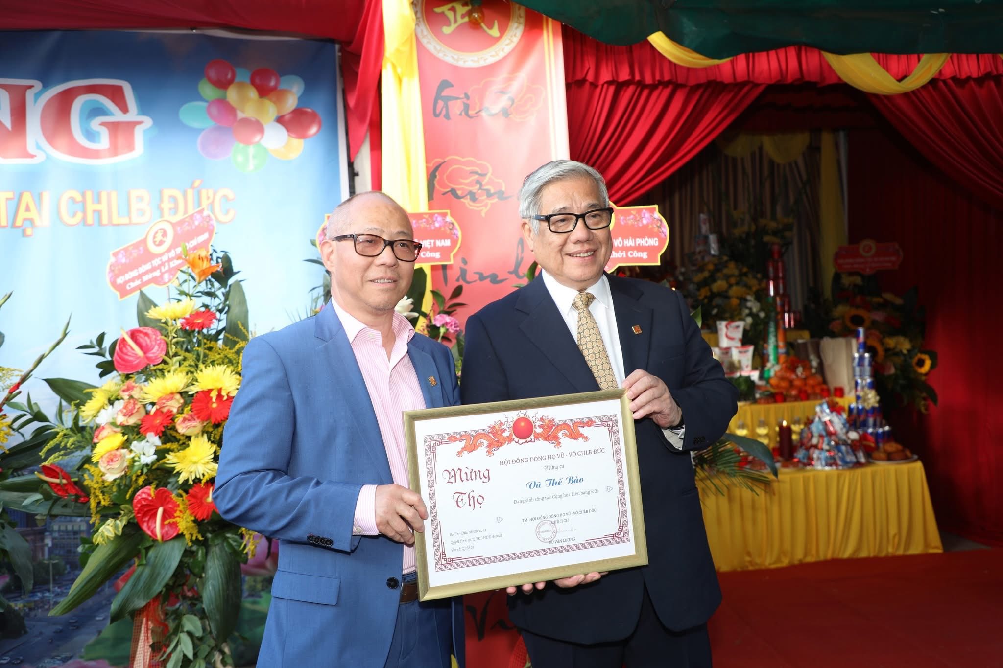Đặc biệt, thay mặt bà con dòng họ tại CHLB Đức, tôi xin gửi lời cảm ơn sâu sắc tới ông Võ Văn Long cùng gia đình. Từ tâm nguyện của mình, ông cùng phu nhân là bà Phan Thị Đào và các con, đã quyết định hiến tặng toàn bộ đất xây dựng, tự vay vốn ngân hàng và đầu tư toàn bộ công trình Nhà thờ. Ông Long còn âm thầm chuyển sang Đức toàn bộ gỗ quý để xây dựng theo kiến trúc nhà thờ gỗ quý điển hình ở quê hương Việt Nam. Đây là nghĩa cử cao quý, thể hiện tâm và tầm của một người con ưu tú, để hôm nay chúng ta có thể khởi công Nhà thờ dòng họ nơi đất khách quê người. Xin trân trọng cảm ơn ông và gia đình.