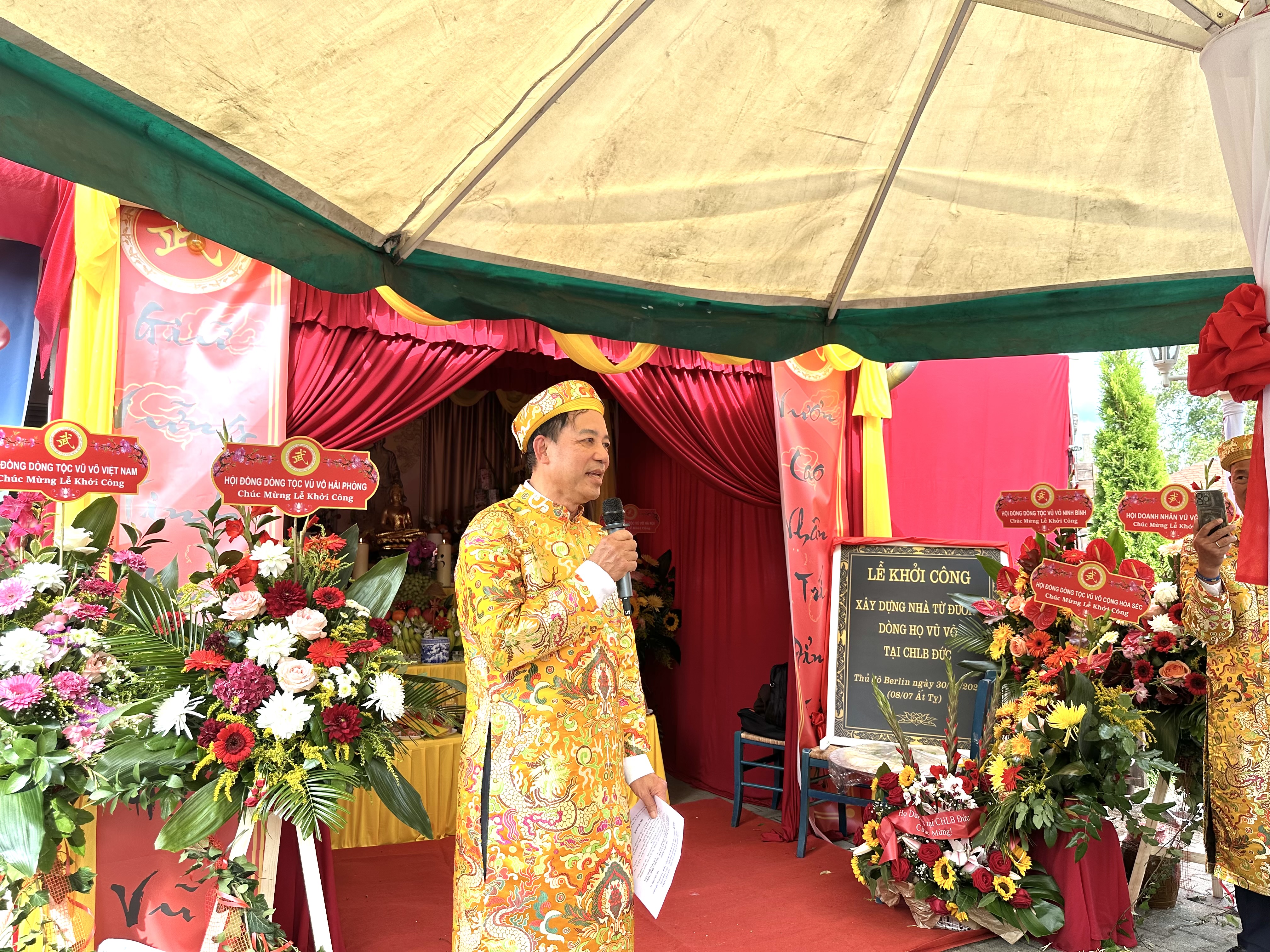 Hôm nay, chúng ta có mặt tại đây để chứng kiến một sự kiện lịch sử trọng đại – lễ khởi công xây dựng Nhà thờ Dòng họ Vũ – Võ tại Cộng hòa Liên bang Đức. Đây là dấu mốc quan trọng, thể hiện tinh thần đoàn kết, quyết tâm gìn giữ và phát huy truyền thống của dòng họ chúng ta.
