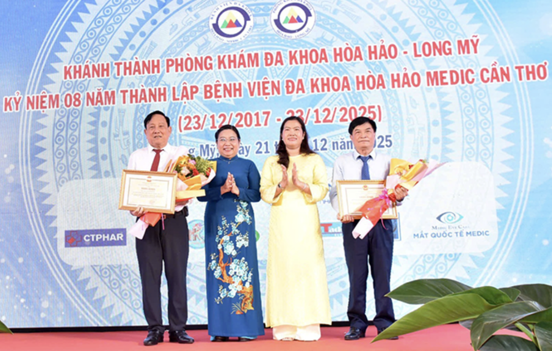 Bà Hồ Thị Cẩm Đào, Phó Bí thư Thành ủy, Chủ tịch UBMTTQVN TP Cần Thơ và Phó Chủ tịch UBND TP Cần Thơ Nguyễn Thị Ngọc Điệp trao bằng khen cho lãnh đạo Bệnh viện Đa khoa Hòa Hảo – Medic Cần Thơ