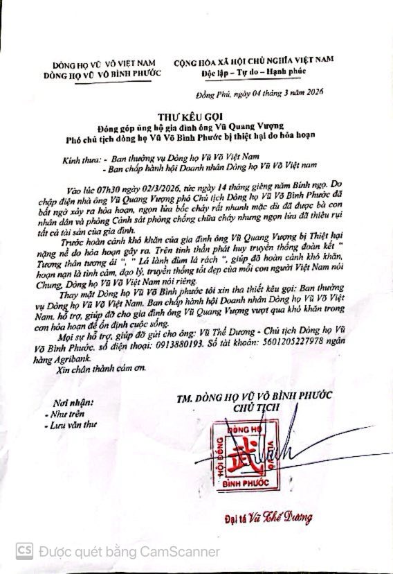 Theo thông tin từ Dòng họ Vũ – Võ Bình Phước, vào khoảng 7 giờ 30 phút ngày 2/3/2026 (tức ngày 14 tháng Giêng năm Bính Ngọ), ngôi nhà của gia đình ông Vũ Quang Vượng, Phó Chủ tịch dòng họ Vũ – Võ Bình Phước, bất ngờ xảy ra hỏa hoạn. Mặc dù lực lượng chức năng cùng người dân địa phương đã nhanh chóng hỗ trợ dập lửa, song vụ cháy đã thiêu rụi hầu hết tài sản trong nhà, gây thiệt hại nặng nề cho gia đình.