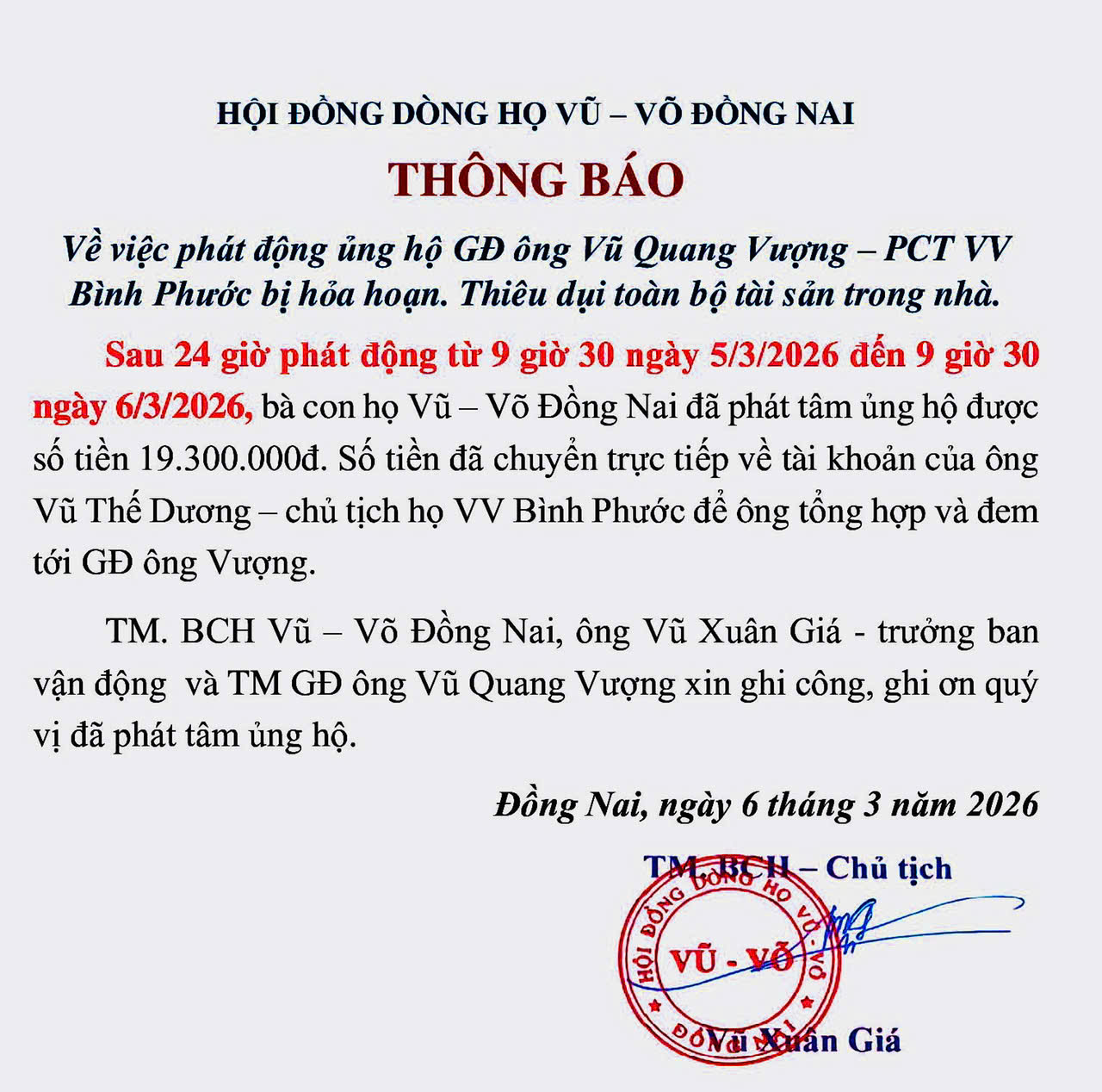 Trước đó, hưởng ứng lời kêu gọi của Hội đồng dòng họ Vũ – Võ Đồng Nai, chỉ trong vòng 24 giờ phát động (từ 9 giờ 30 ngày 5/3 đến 9 giờ 30 ngày 6/3/2026), bà con dòng họ Vũ – Võ tại Đồng Nai đã quyên góp được 19,3 triệu đồng. Số tiền này đã được chuyển trực tiếp về tài khoản của ông Vũ Thế Dương, Chủ tịch dòng họ Vũ – Võ Bình Phước để tổng hợp và trao tới gia đình ông Vượng.