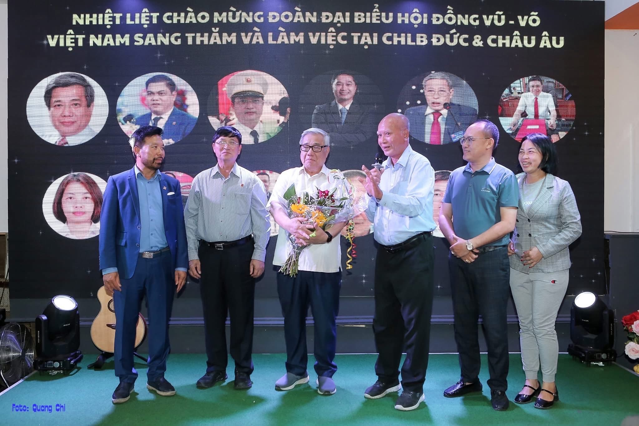 GS.TSKH.NGND Vũ Minh Giang – Chủ tịch HĐDH Vũ – Võ Việt Nam, Thiếu tướng Vũ Đức Khiển – PCT HĐDH Vũ Võ Tp HCM nhận hoa từ HĐDH Vũ – Võ CHLB Đức